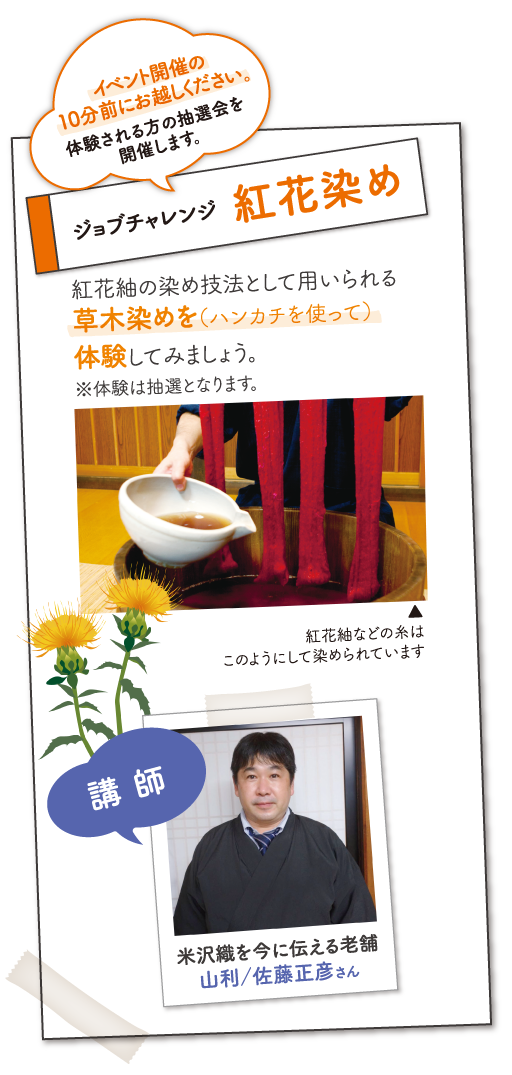皆さまに挑戦していただくのは「紅花染め」。